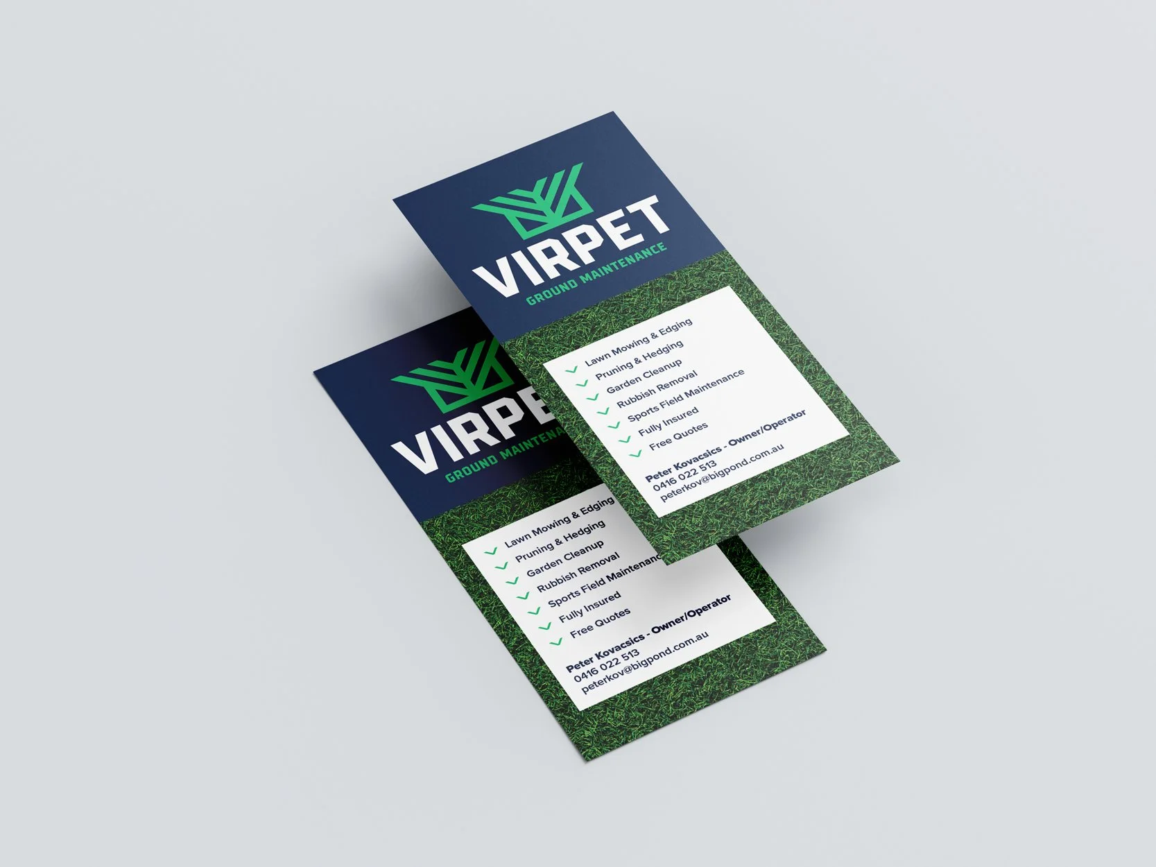 Prior to launching Virpet, Peter and Virginia have been working in the landscaping/ground maintenance industry for a long time so we needed to create a logo and brand identity that was reflective of that. We wanted clean, bold, solid visuals that communicate the professionalism and experience that Virpet offers while also reflecting the industry they operate in.